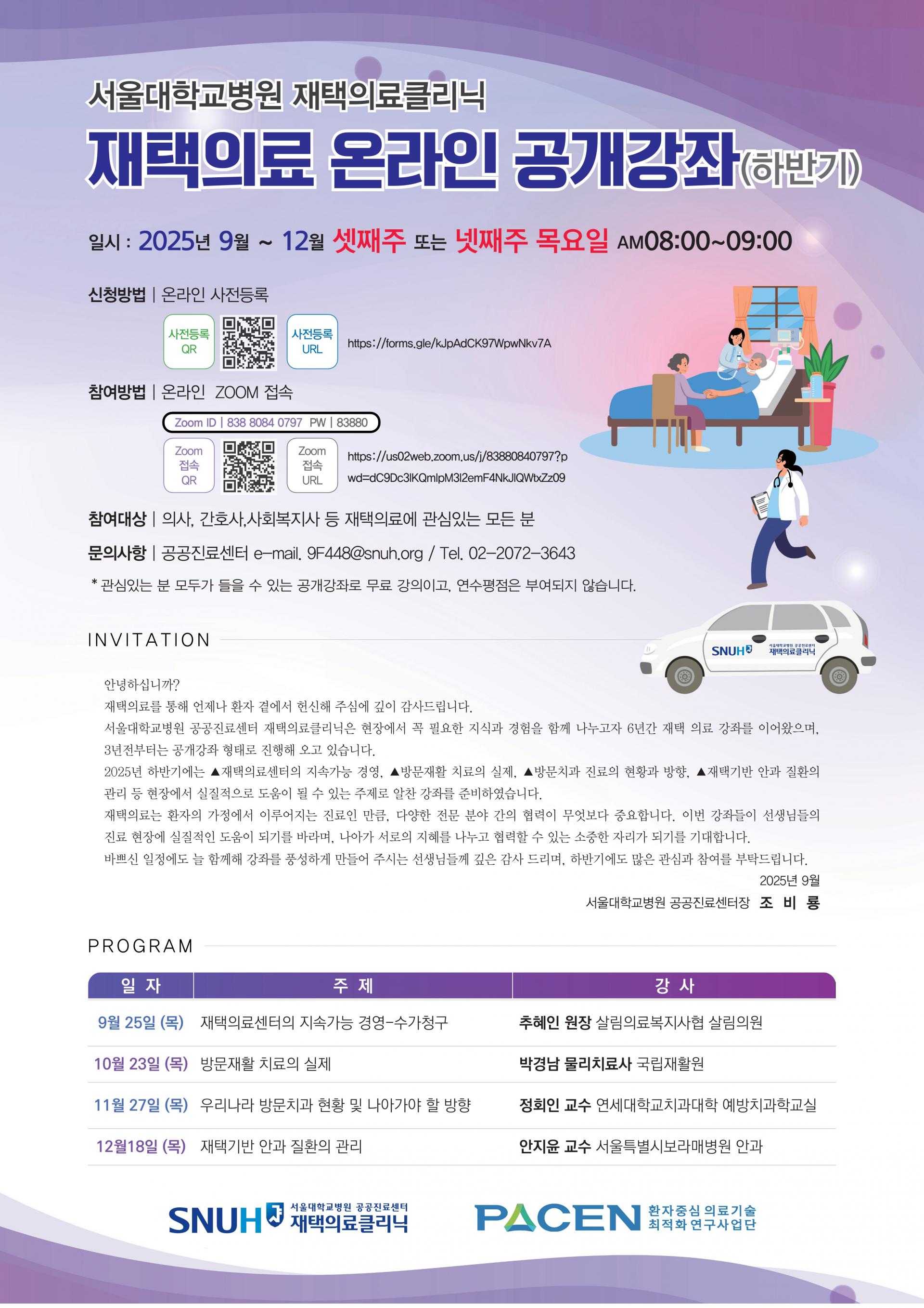 2025년 9월부터 12월, 셋째주 또는 넷째주 목요일 오전 8시~9시 재택의료 온라인 공개강좌를 개최합니다.